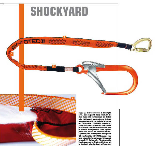 - SHOCKYARD 全長上皆有減震運作。若發生事故,下墜能量會被很好控制在6kN以下,平衡減震,不會有負荷峰值轉換為SHOCKYARD的下墜減震繩器的塑性變形。