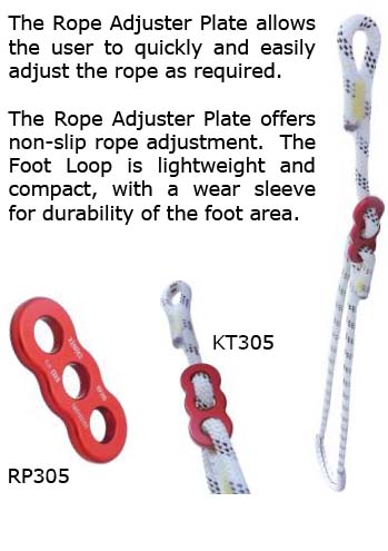The Rope Adjuster plate allows the user to quickly and easily adjust the rope as required . The Rope Adjuster Plate offers non-slip rope adjustment . The Foot Loop is lightweight and compact , with a wear sleeve for durability of the foot area.