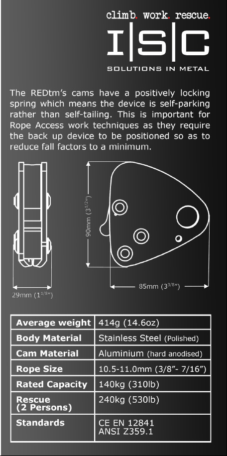 The REDtm’s cams have a positively locking spring which the device is self-parking rather than self-tailing . This is important for Rope Access work techniques as they require the back up device to be positioned so to reduce fall factors to a minimum.