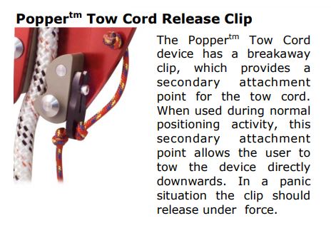 The Popper device is a breakaway release clip, which provides a secondary attachment point for the tow cord. When used during normal positioning activity, this secondary attachment point allows the user to tow the device directly downwards. In a panic situation the popper clip is designed to release under load and mitigate against uncontrolled towing of the device.