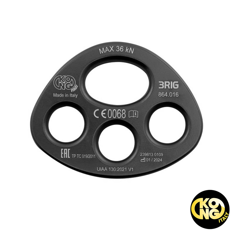 KONG 3RIG - 3孔分力盤 3 個孔、直徑 20 毫米的索具盤, 上面的孔可以同時安裝兩個登山扣。 由輕質鋁合金製成,非常輕巧且耐用。 全新 10 毫米厚版本帶有斜孔,可直接插入紡織品(繩索、掛繩、帶子),無需連接器。 義大利製造 重量:95克 認證:CEN TS 16415 RfU CNB/P/11.114 斷裂負荷:36kN