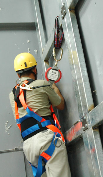 ↑ 重量輕,掛在安全帶上,攜帶方便。 →高空作業時有防墜需要時,立即掛上固定點。
